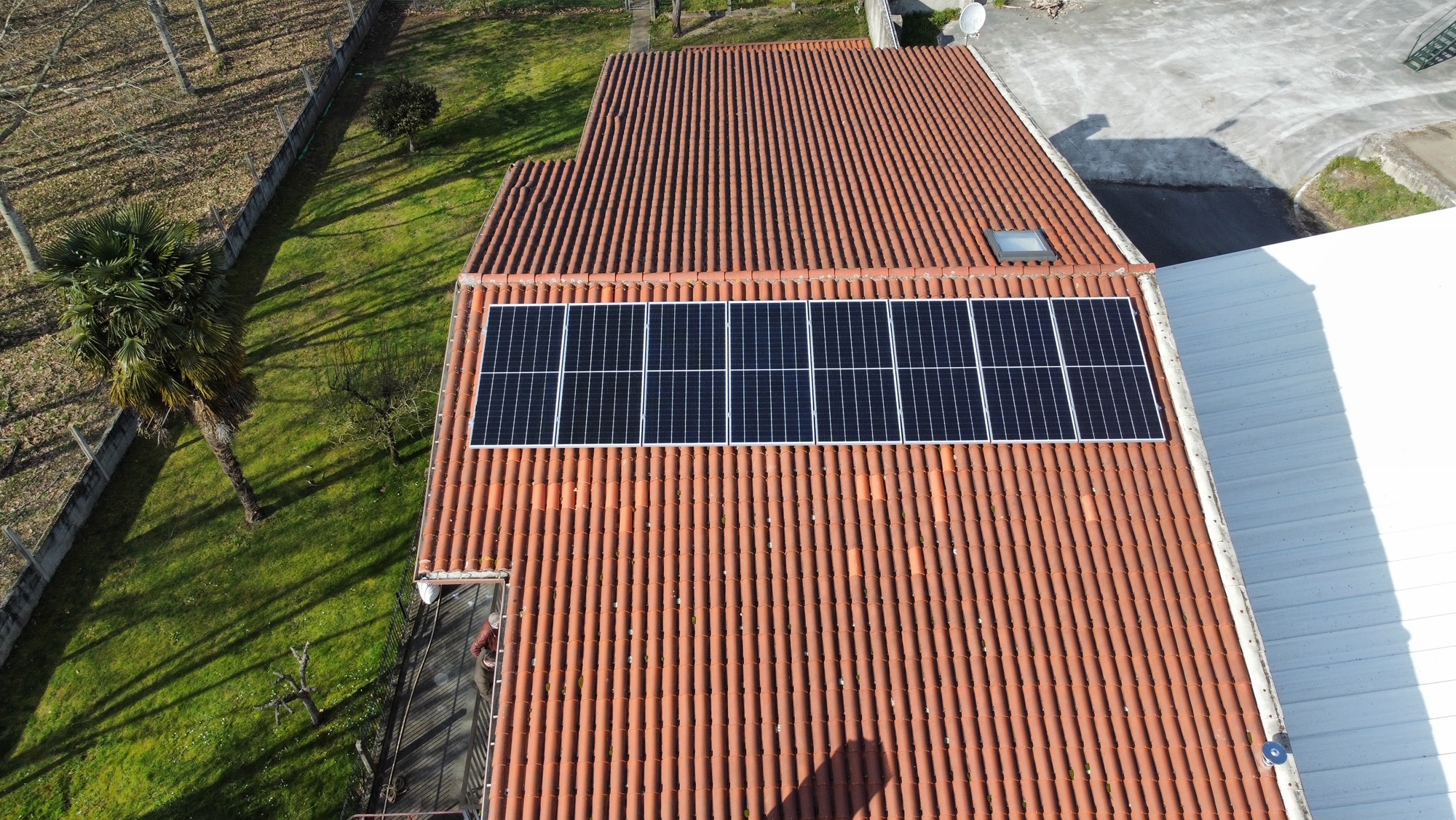 La instalación fotovoltaica está constituida por 8 módulos fotovoltaicos de células de silicio monocristalino, de 470 Wp cada uno, que se conectan eléctricamente entre sí y van instalados sobre cubierta coplanar. La energía generada por los paneles es autoconsumida por la propia empresa y los excedentes se vierten a la red de baja tensión, haciendo uso para todo ello de un inversor de 5 kW.